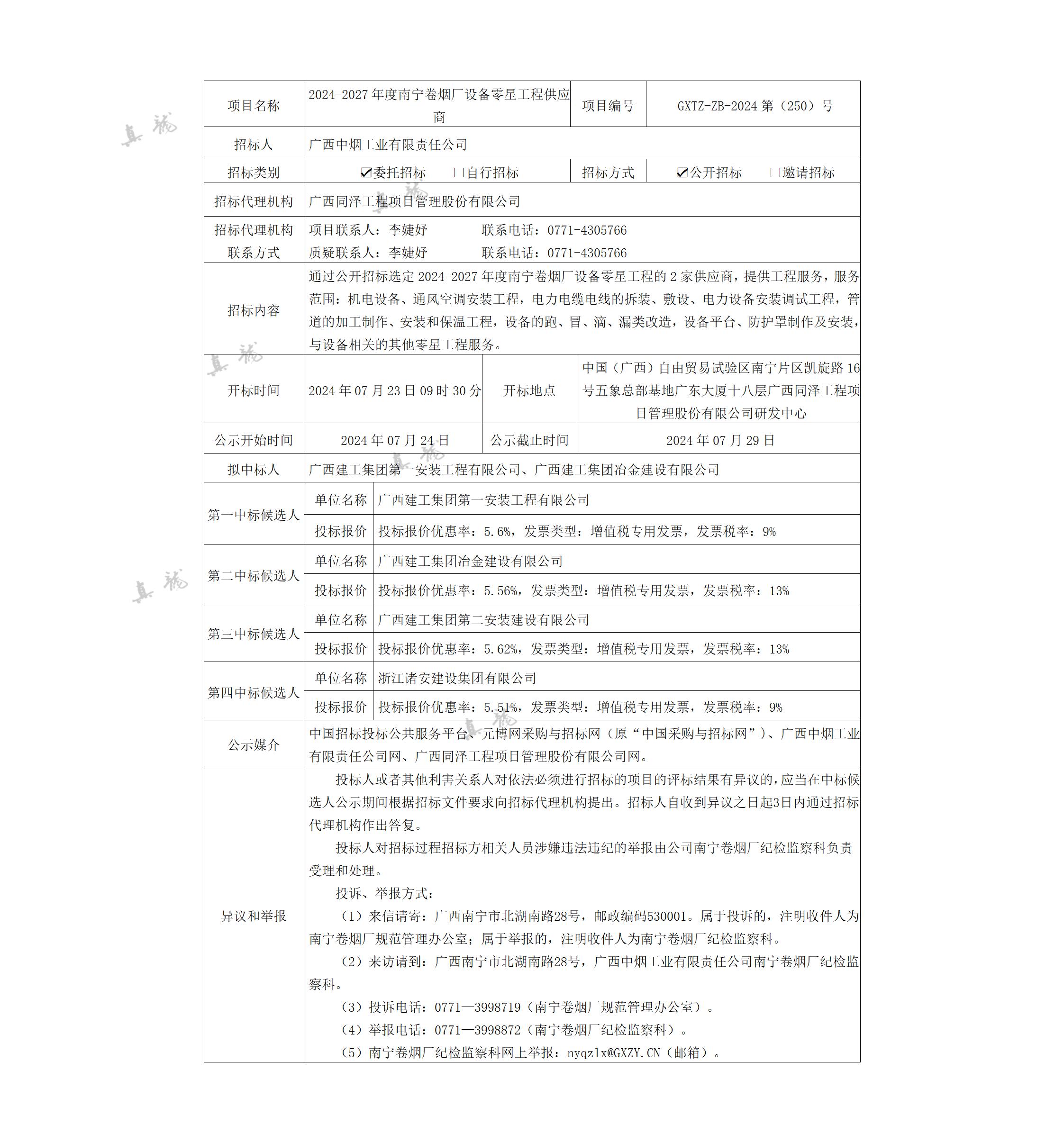 廣西中煙工業(yè)有限責任公司2024-2027年度南寧卷煙廠(chǎng)設備零星工程供應商(項目編號:GXTZ-ZB-2024第(250)號)中標候選人公示