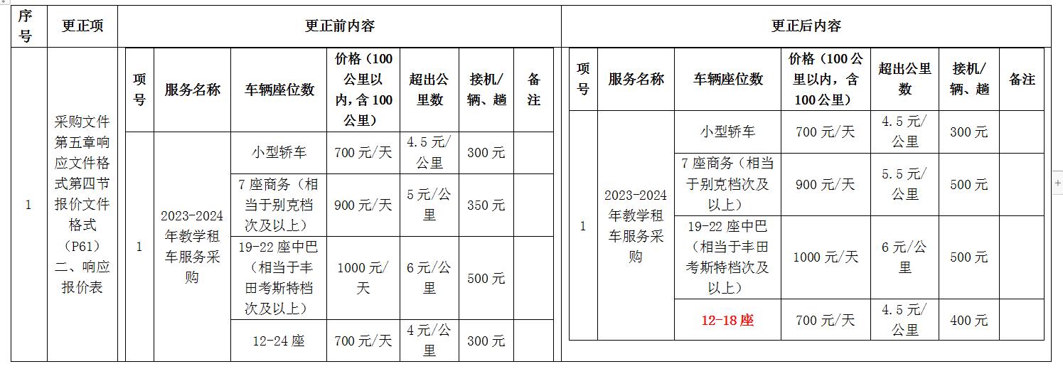 更正內容:招標文件中,所有租車(chē)價(jià)目表以更正后內容為準: