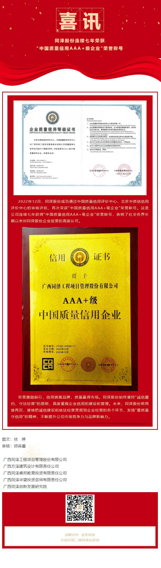 喜訊 | 同澤股份連續七年榮獲“中國質(zhì)量信用AAA+級企業(yè)”榮譽(yù)稱(chēng)號